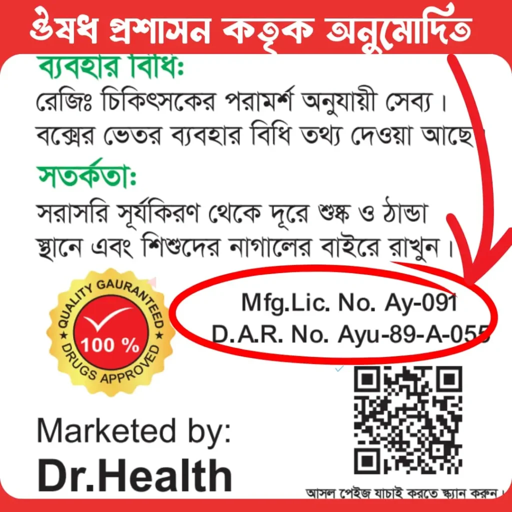 - ঔষধ প্রশাসন কতৃক অনুমোদিত লাইসেন্স নং Ay-091 D.A.R. No. Ayu-89-A-055